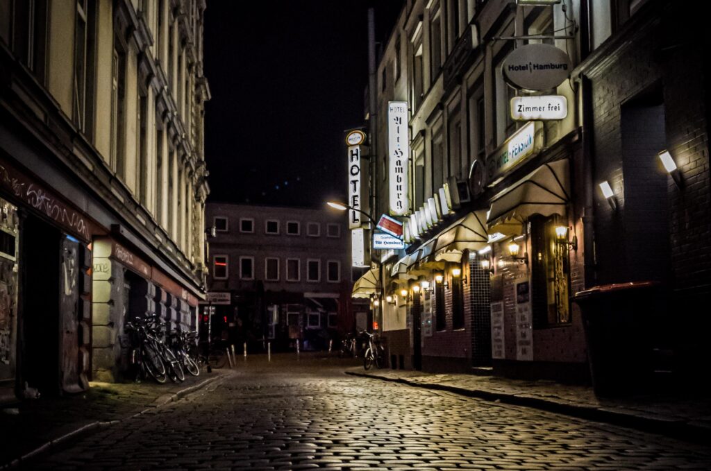 - dzielnica Reeperbahn nocą, gdzie panuje imprezowa atmosfera i mogą zdarzać się zaczepki,